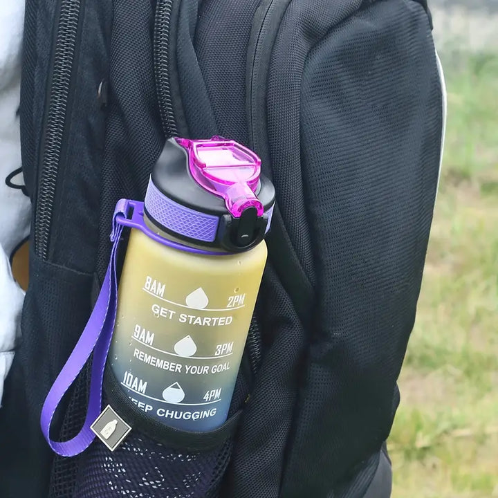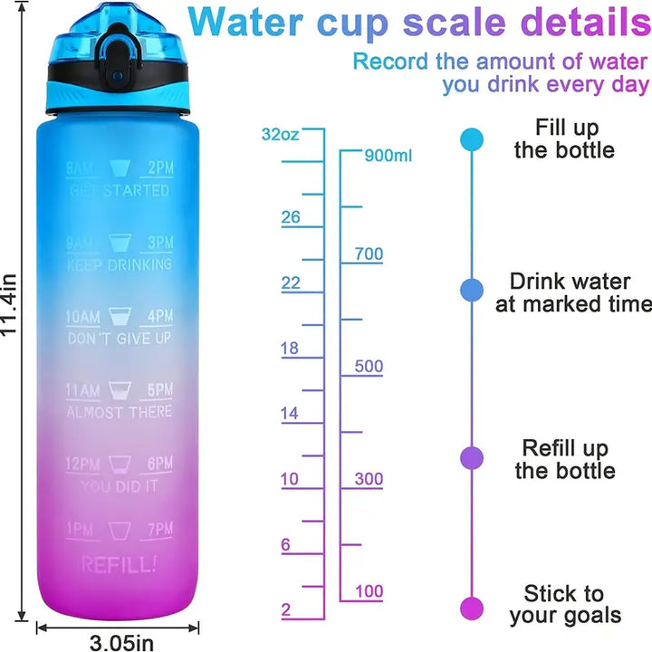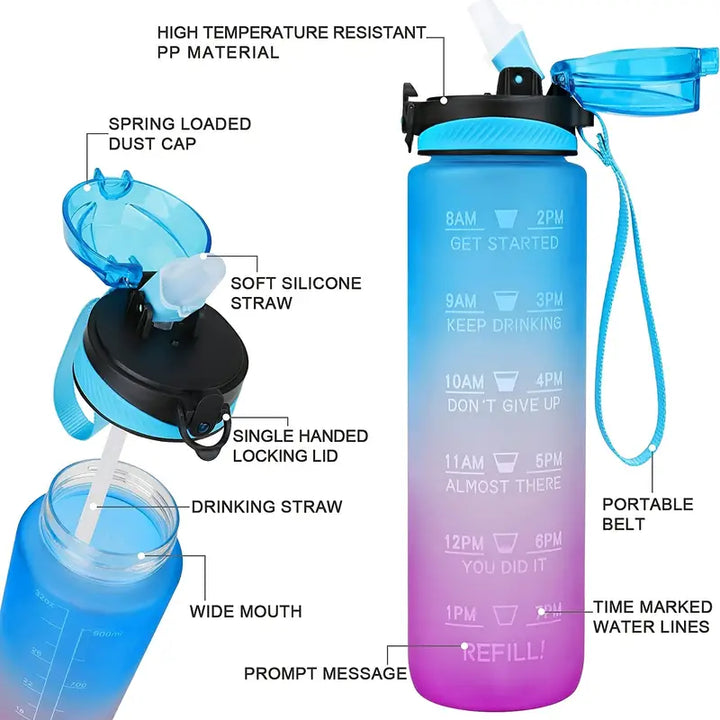 Keep yourself properly hydrated with this 32oz fitness water bottle, engineered for active individuals who prioritise wellness. The non-toxic plastic construction delivers durability without compromising safety, whilst the leak-proof seal and convenient flip-top mechanism make it ideal for gym sessions, outdoor activities, or daily use. An integrated time marker helps you monitor your hydration intake systematically throughout the day, supporting your fitness objectives. The included filter ensures water quality, maintaining freshness between refills. Available in five striking colours—Purple, Black, Green, Blue, and Orange—this bottle combines practical functionality with personal style, making consistent hydration both achievable and sustainable.
